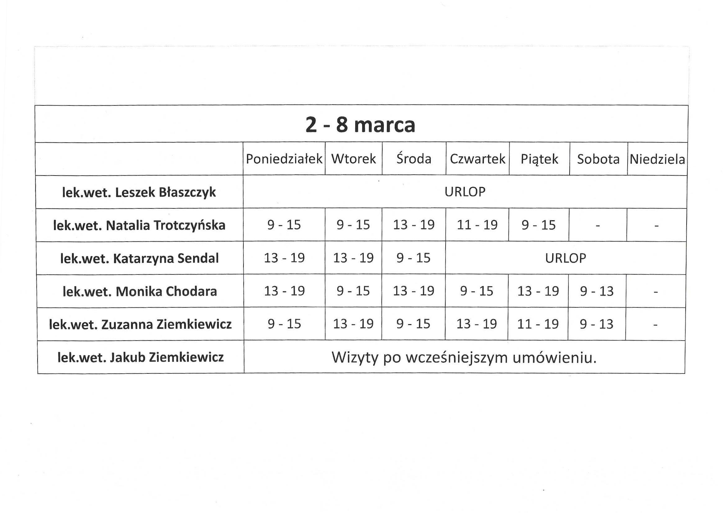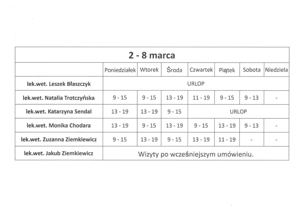 Grafik lek.wet. Leszek Błaszczyk – urlop 27 lutego – 8 marca lek.wet. Katarzyna Sendal – 5 – 16 marca